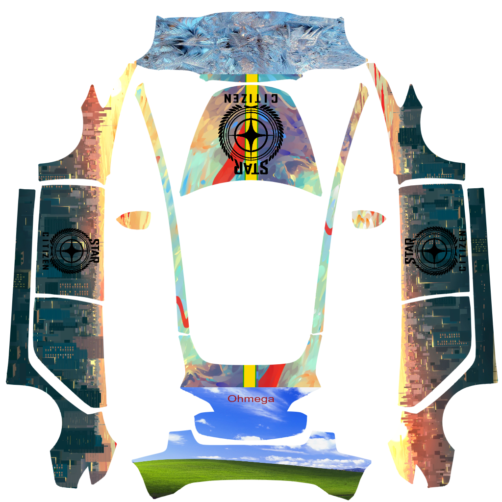 Sunset cityline with the XP on the back. Star Citizen logo on the front doors and the frunk cover.